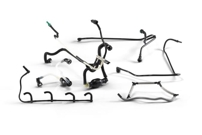 Molded fuel lines carry fuel from fuel tank to injectors. Product line includes also injector return pipes, fuel filter hoses, hand pumps product sub-groups.
